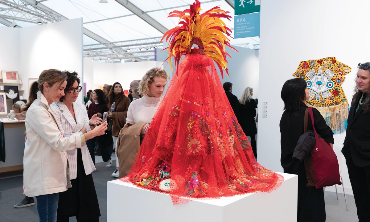 At Frieze London 2025, the Artist-to-Artist section features emerging artists selected by established names, including René Treviño chosen by Amy Sherald and Ilana Harris-Babou nominated by Camille Henrot. Treviño's solo presentation centers on the sculpture 'Regalia, Moscas Brillantes (Rojo)' (2025), which addresses queer resistance and colonial histories through a fusion of Aztec and European aesthetics. Other presentations include Katherine Hubbard's photographs about her mother's dementia (nominated by Nicole Eisenman), T. Venkanna's delicate works on gender and patriarchy (picked by Bharti Kher), Ana Segovia's subversive cowboy paintings (selected by Abraham Cruzvillegas), and Neal Tait's paintings (chosen by Chris Ofili).