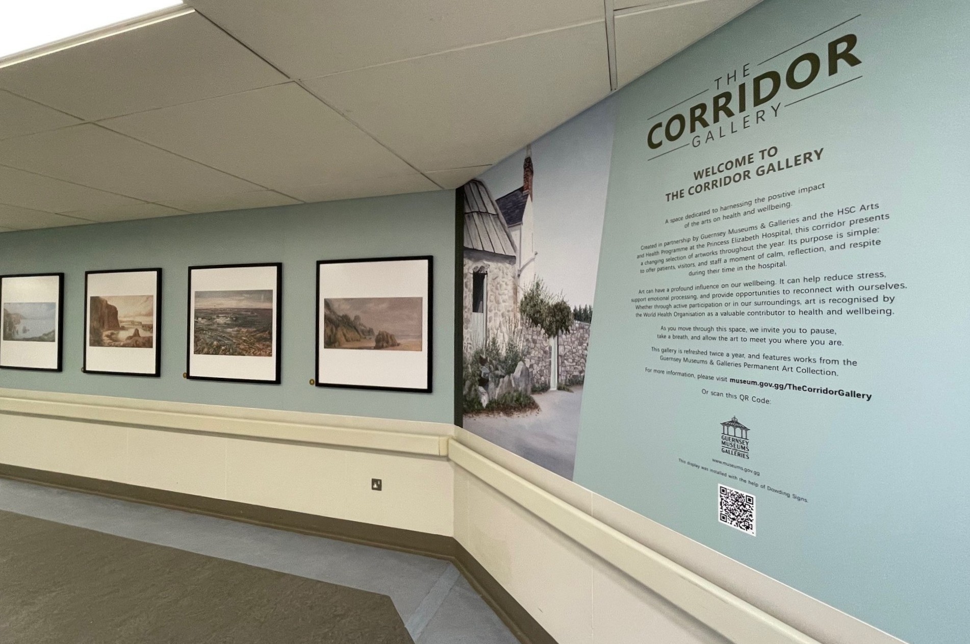 Guernsey Museums and the Health and Social Care Arts and Health Programme have launched the Corridor Gallery at the Princess Elizabeth Hospital. This new initiative converts a hospital corridor into a rotating exhibition space featuring high-quality reproductions from the museum's permanent collection. The inaugural exhibition, "Blue Spaces," focuses on the therapeutic relationship between aquatic environments and mental wellbeing, showcasing blue-toned landscapes ranging from abstract to impressionistic styles.